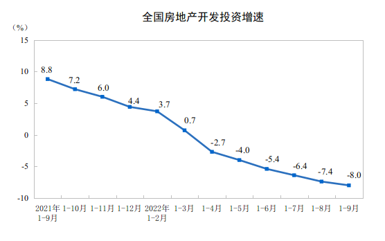 1—9月份,全國房地產開發投資103559億元,同比下降8.0%;其中,住宅投資78556億元,下降7.5%。