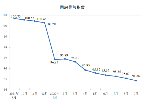9月份,房地產開發景氣指數(簡稱“國房景氣指數”)為94.86。